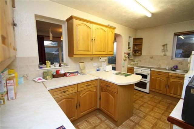 Stainless steel single drainer sink unit set in work surface with cupboards and drawers, further work surface and breakfast bar with cupboards and drawers. Space for appliances, wall cupboards, part tiled walls, gas fired boiler, double glazed window.