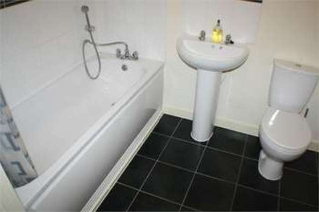 Tiled floor, part tiled walls, panel enclosed bath with mixer tap and shower attachment, hand wash pedestal basin, low level WC, radiator, extractor fan, shaver point.
