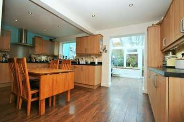 UPVC window to rear. UPVC glazed door to side. Fully fitted replacement kitchen comprising eye level units, solid MDF base units with drawers and work surfaces over. Inset stainless steel one and a half bowl sink with mixer taps. Integrated eye level oven. Integrated microwave. Reconstituted stone partially tiled walls. Vertical radiator. High grade timber effect flooring with under floor heating. Low energy LED down lighting. Under cupboard LED lighting. Integral AEG dishwasher. Integral AEG double oven. NEFF 5 burner gas hob with Wok burner and hood. Double American Samsung fridge freezer (by separate negotiation). Opening to reception room/conservatory.