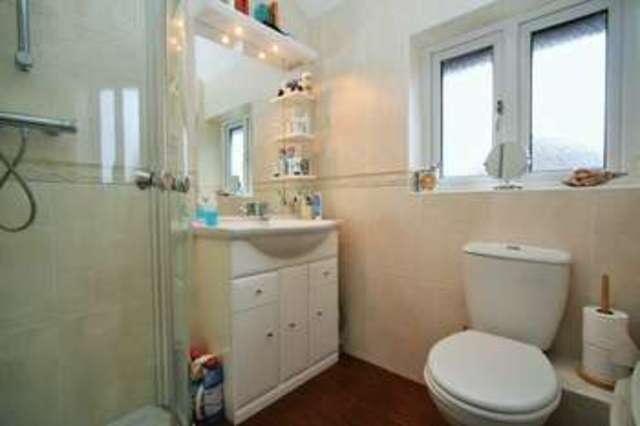 UPVC opaque window to side. Low level WC. Walk-in shower cubicle with mixer power shower (German Grohe shower head and controls). Wash hand-basin with built-in cupboard unit. Panelled oval bath. Ceramic floor tiles with under floor heating. Vanity unit with mirror lighting and shaver point. Ceramic wall tiles. One wall covered with one piece mirror.