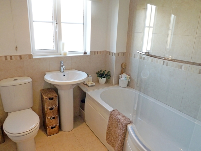 Obscure double-glazed window to front elevation. Ceramic tiled flooring. Contemporary white suite comprising panelled SHOWER BATH with chrome mixer tap, wall-mounted chrome POWER SHOWER over and fitted glass shower screen, low level WC and pedestal wash hand basin with chrome mixer tap over. Part tiled walls. Radiator. Extractor fan.