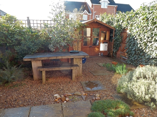 Low maintenance laid to pea gravel with paving leading to SUMMERHOUSE. Personal gate to side leading to FURTHER PARKING SPACE. Fully enclosed by walling to two sides and a fence between neighbouring house. There are small specimen plants and trees including a eucalyptus tree. Outside light.
