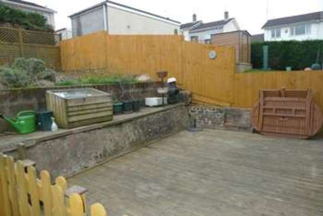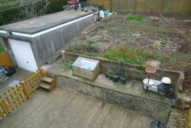 enclosed tiered garden, mainly laid to decking with vegetable patch and patioarea. fenced boundaries, gated side access and outside tap.