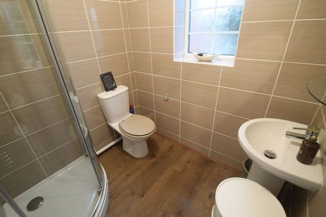 Accessed via first floor landing. Comprising of double glazed obscured window, chrome heated towel rail, walk in shower unit, low level flush W.C, pedestal wash basin and fully tiled walls.