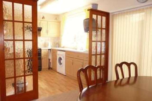 With double glazed window to the rear overlooking the garden. Fitted roller blind. Fluorescent light. Centre light in dining area. There is a good range of wall and base units with melamine work surfaces and tiled splashback. Stainless steel sink with left hand drainer and mixer tap. Cooker extractor hood. Electric cooker point. Plumbed for automatic washing machine. Television point. Ample space for table and chairs. Door into integral garage. Double panel radiator. Painted skirting. Vinyl flooring in kitchen area and fitted carpet in dining area.