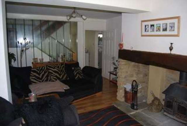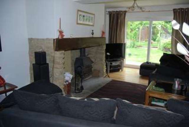 High mantled fire surround with stone recessed fireplace with slab hearth and log burning stove. Radiator. TV aerial point. Full length sliding patio doors to rear garden.