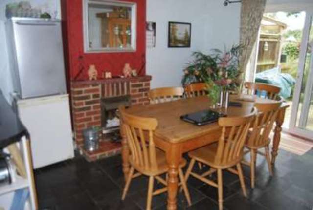 Kitchen area recently fitted comprising 1 1/2 bowl inset single drainer sink unit with chrome pedestal mixer tap. Full compliment of matching base and wall mounted cupboards. Integrated dishwasher. Utility space and plumbing for washing machine. Peninsular breakfast bar divider with open end display. Stainless steel back plate to cooking station with stainless steel extractor hood with downlight. Tiled splashbacks to all work surfaces. Ceiling with downlights. uPVC double glazed window to front. Ceramic tiled flooring extends to DINING AREA: Red brick fire surround with tiled hearth and polished wood mantle. Radiator. Full length uPVC double glazed doors to rear garden.