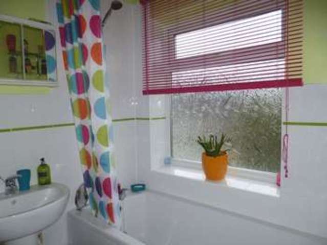 Vinyl flooring. Modern white suite comprising panelled bath with shower mixer taps and pedestal wash basin. Radiator. UPVC double glazed window with fitted venetian blind. Part tiled walls.