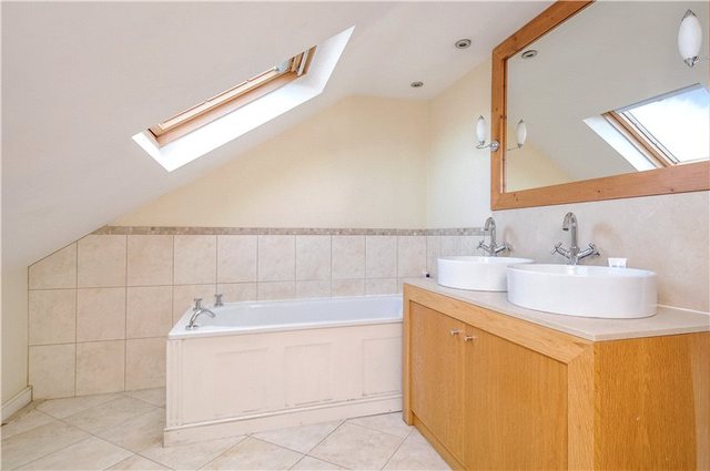 EN SUITE BATHROOM Velux windows to the front aspect. Panel enclosed bath. His and hers vanity unit with double sink and cupboard below. Low level wc. Part tiled walls and tiled floor.