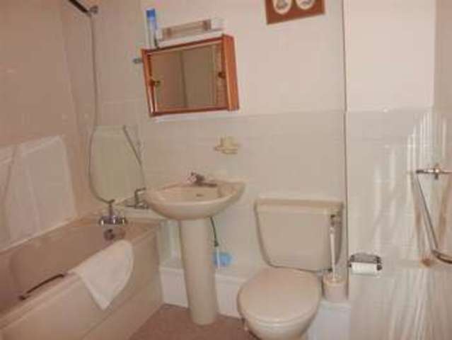 Matching suite comprising; pedestal hand wash basin with wall mounted mirrored cabinet and light above, w.c, bath with mixer tap and shower attachment. Part tiled walls, artex and coved ceiling.