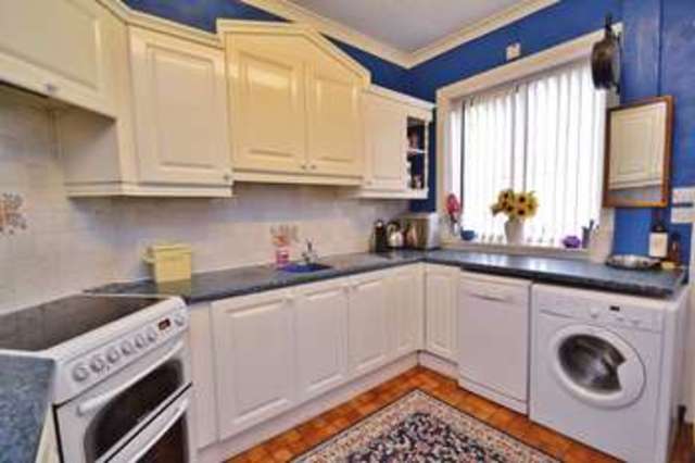 Fitted with a range of wall and base units, with complimentary roll top work surface and integrated stainless steel sink and extractor. Space and plumbing for fridge freezer, cooker, washing machine and dishwasher. Tiled floors, rear door leading to garden and hardwood double glazed window to the rear. Under counter spotlights, power point and ceiling light point.
