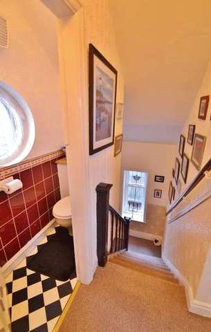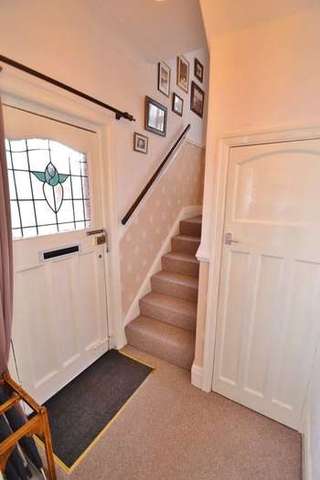 Carpeted floors, access to all rooms on the first floor, original leaded stained glass window to the side and ceiling light point.