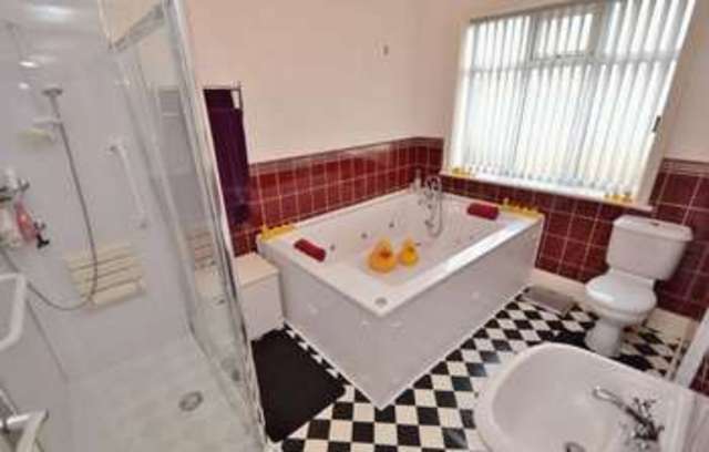 Four piece suite, comprising of low level W.C., ceramic wash basin, corner walk-in shower and double sized Jacuzzi bath. Built-in storage cupboard, partly tiled walls, vinyl floors, uPVC frosted window to the rear and ceiling light point.